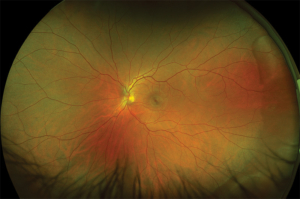 従来の眼底カメラよりも広角に撮影する事ができる器械で、撮影範囲が200°となっており、眼底の約80%の撮影が可能とされており、従来の眼底カメラでは撮影できなかった眼底疾患の早期発見に繋がります。